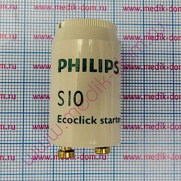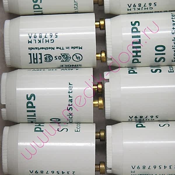 Стартер S10 Philipsне содержит свинца и радиоактивных веществ. Pin-Up такойстартер, вы увеличиваете срок Pin-Up лампы более чем на 25%. Медные штырькистартераустойчивы к окислению. Деталь имеет огнеупорные компоненты и УФ-устойчивый корпус для дополнительной безопасности запуска.
